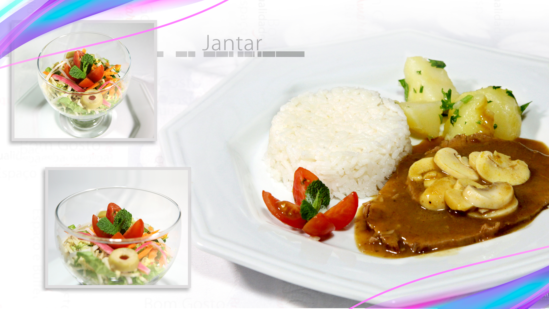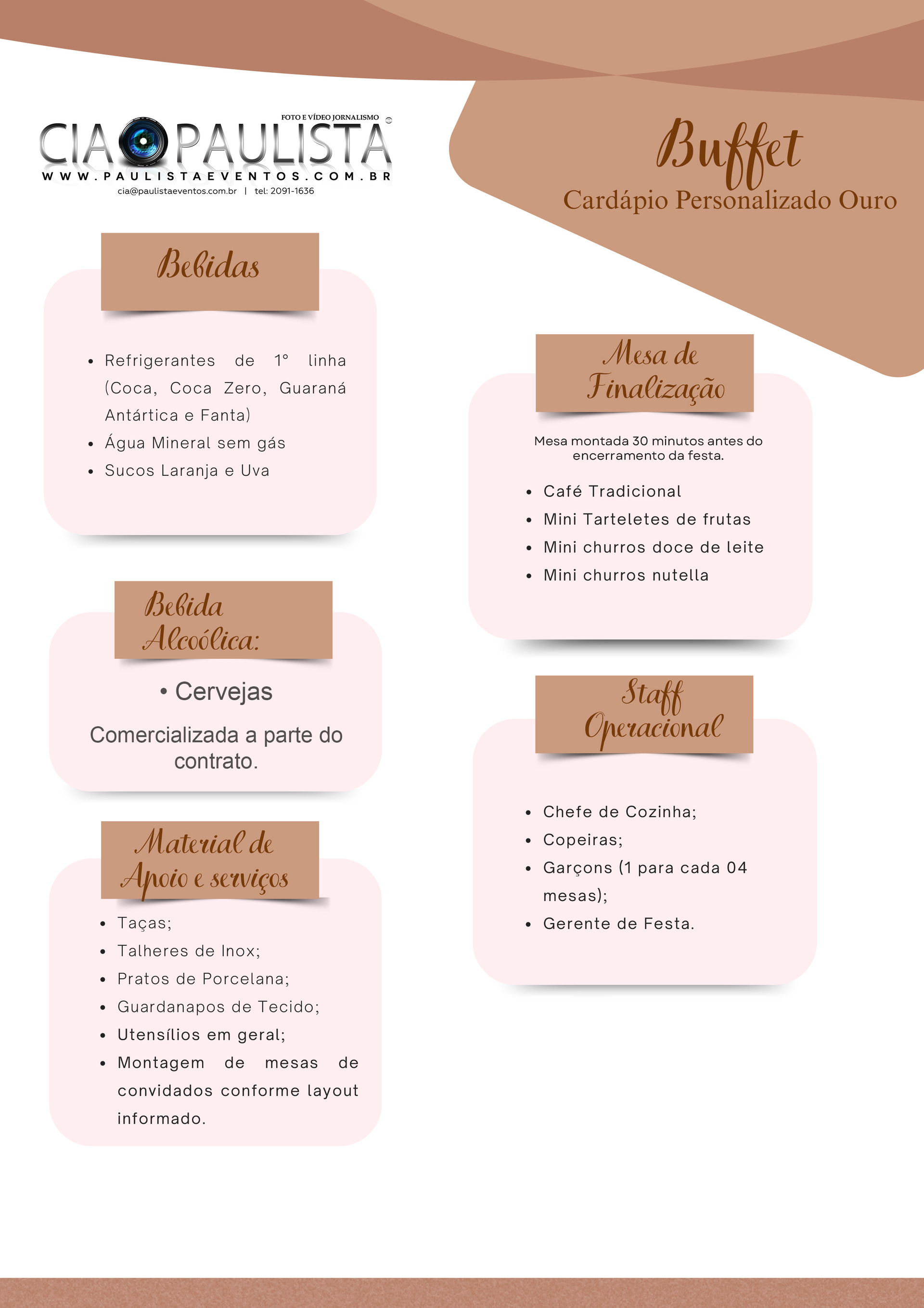 23) Buffet, Coquetel com Jantar completo: Canapés 3 queijos, salpicão de frango, caponata de berinjela, Finger food, salgados diversos fritos e assados, Coquetel de sabores, Jantar com salada mix de folhas, arroz, batata sauté, carne bovina ao molho madeira, massa recheada, suco e refrigerantes de primeira linha, água mineral, sobremesa e saída mesa de café com minis tarteletes e churros.