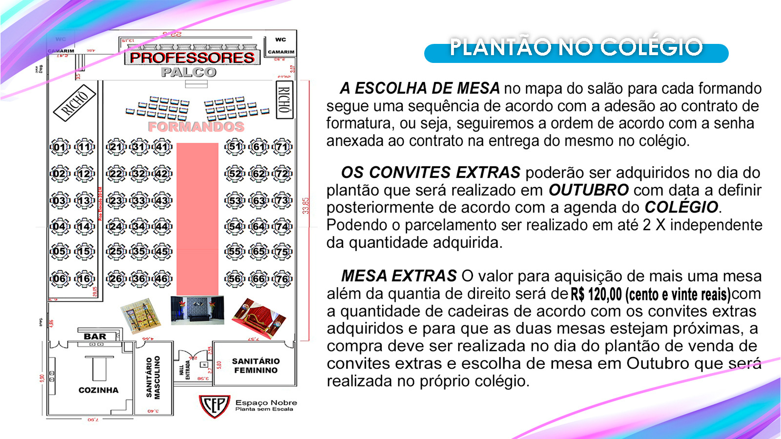 10) Mesas Extras: O valor para aquisição de mais uma mesa além da quantia de direito será de R$ 120,00 (cento e vinte reais) com a quantidade de cadeiras de acordo com os convites extras adquiridos e para que as duas mesas estejam próximas, a compra deve ser realizada no dia do plantão da venda de convites extras e escolha de mesa no mês de outubro no próprio colégio com agendamento prévio.
