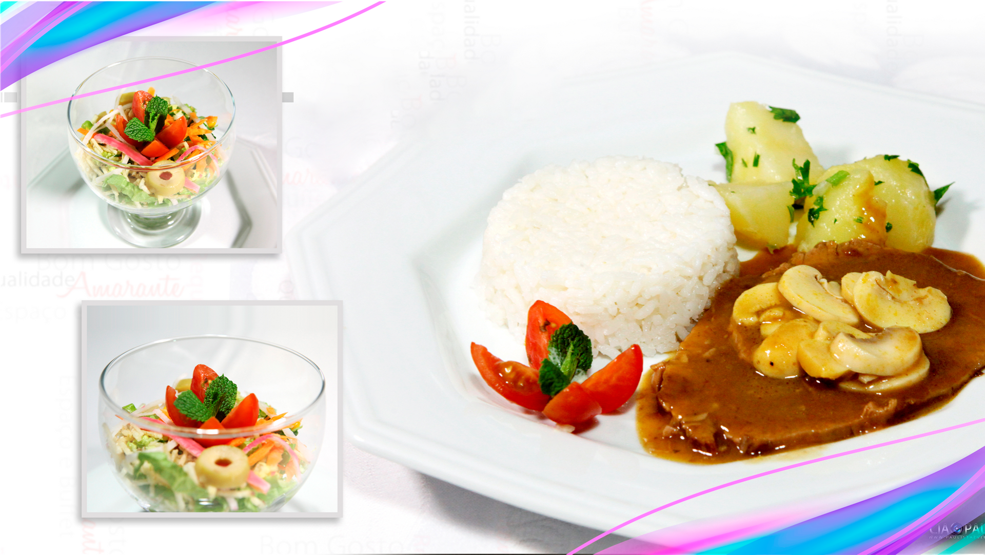 18) Buffet, Coquetel com Almoço completo: Canapés, Finger food, Salgados diversos fritos e assados, Mini Hot Dog, Hamburguinho, Almoço com salada, arroz, Strogonoff de Frango, Batata Palha, Sucos e Refrigerantes de primeira linha, Água Mineral e Saída mesa com Café.